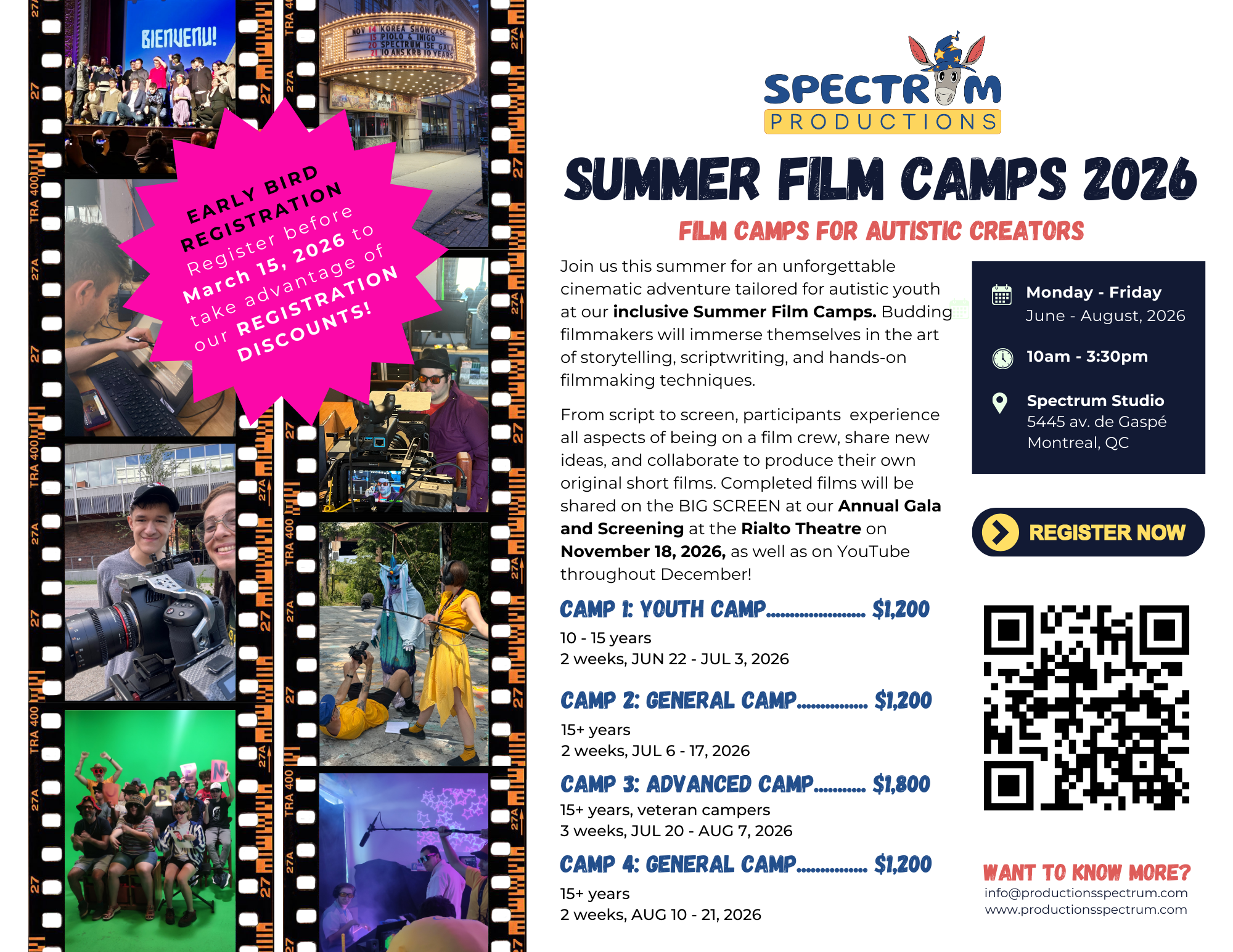 Films created in camp will be screened at the Rialto Theatre on November 18, 2026 for our 17th Annual Gala! They will also be released throughout the month of December on our Spectrum Studios YouTube Channel. Like and subscribe today!